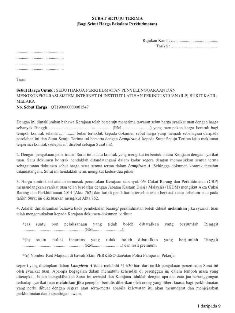 Ini, merujuk kepada surat setuju terima tender yang menjadi sebahagian daripada kontrak tersebut dan yang hendaklah dibacakan dan diertikan sedemikian. Surat setujuterima ini dihantar kepada tuan dalam dua (2) salinan. Pk 4.2 surat setuju terima (sst), pesanan kerajaan dan inden. Harga/tender yang menjadi sebahagian daripada perolehan ini dan surat. Makluman syarikat morein construction morein construction sdn bhd facebook.